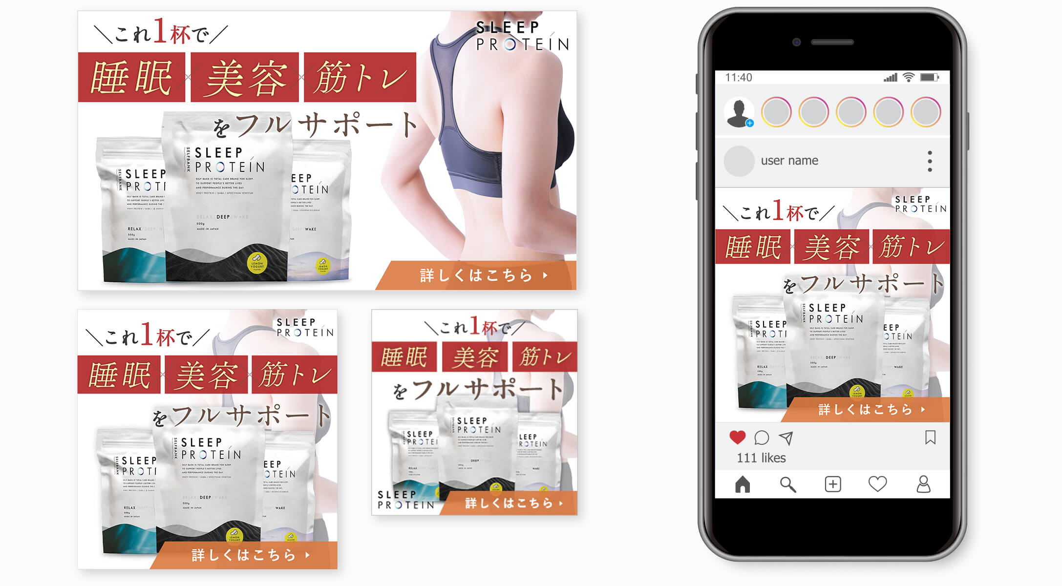 - ランサーズにてランディングページ( https://sleep-protein.com/ )に合わせたデザインで高級感、清潔感がありながら、訴求ポイントがしっかり伝わるバナーを要望されているコンペに参加しました。